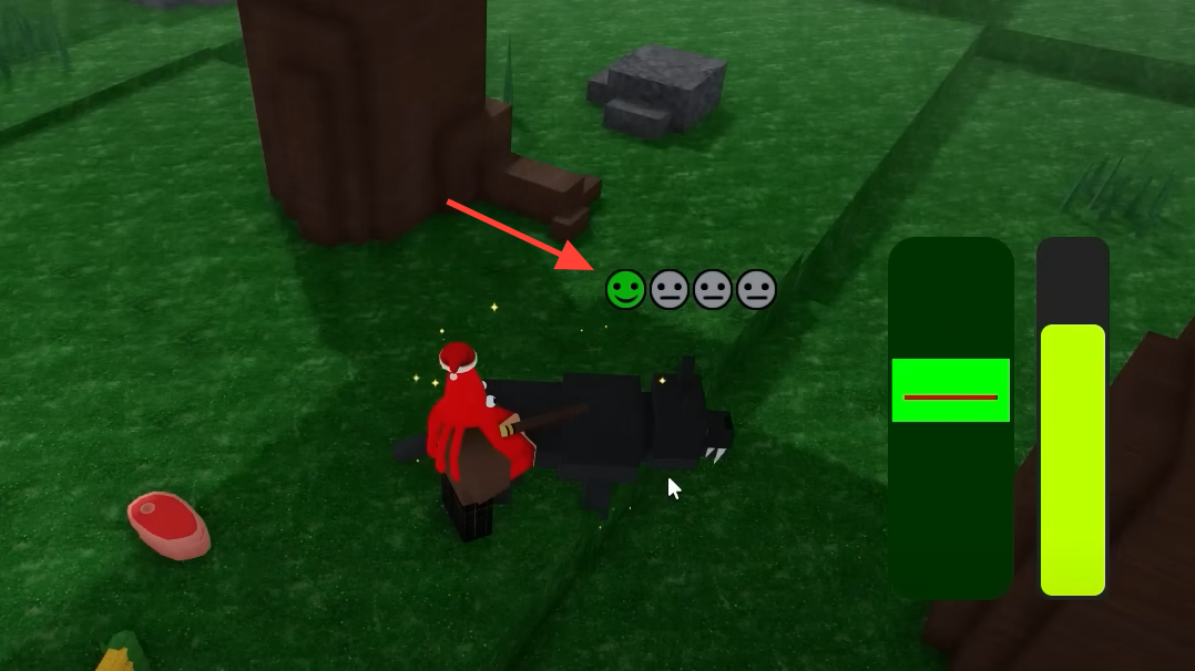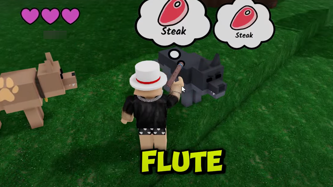 Taming in 99 Nights in the Forest is a two-step loop: pacify a target with the flute mini-game, then feed what it asks for to advance a taming stage. Repeat until every face icon over the animal turns green and flips to pink hearts. Once tamed, you can make the animal follow, sit, or leave your world entirely, and you can rename it. You can keep two pets at a time.