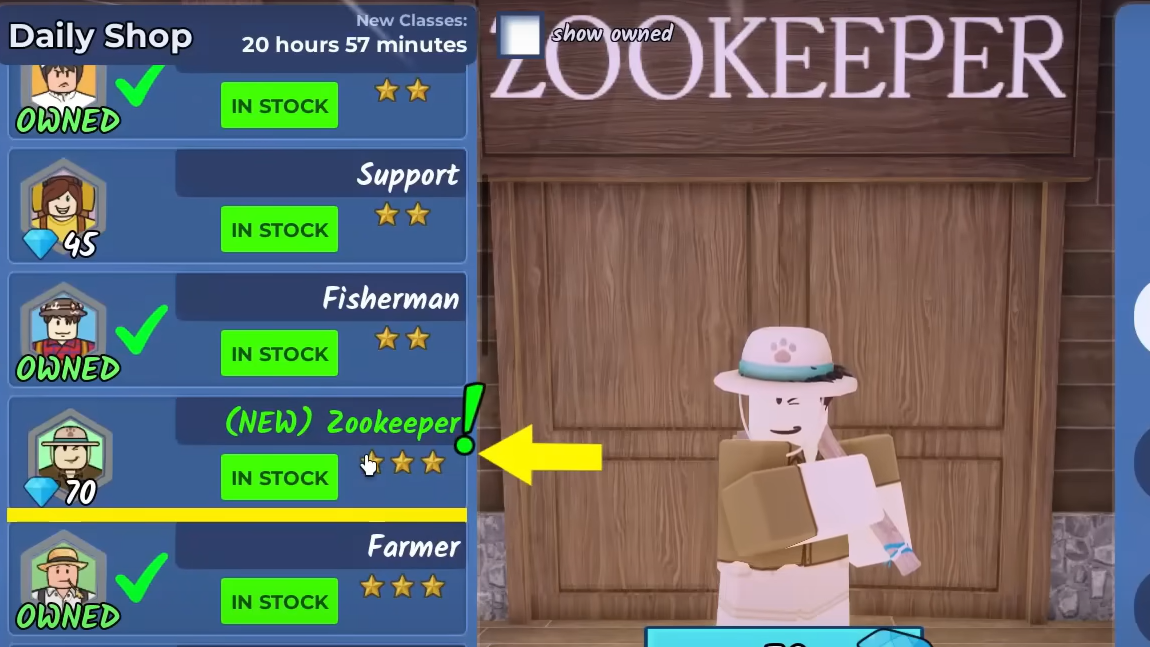 Zookeeper is a taming-focused class tied to the Taming Update. It costs 70 Diamonds in the Daily Class Shop and starts rounds with an Old Taming Flute. Its perks speed up flute leveling, increase health restored when feeding pets, and make taming faster with the flute. The class does not raise the default pet limit.