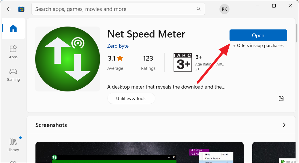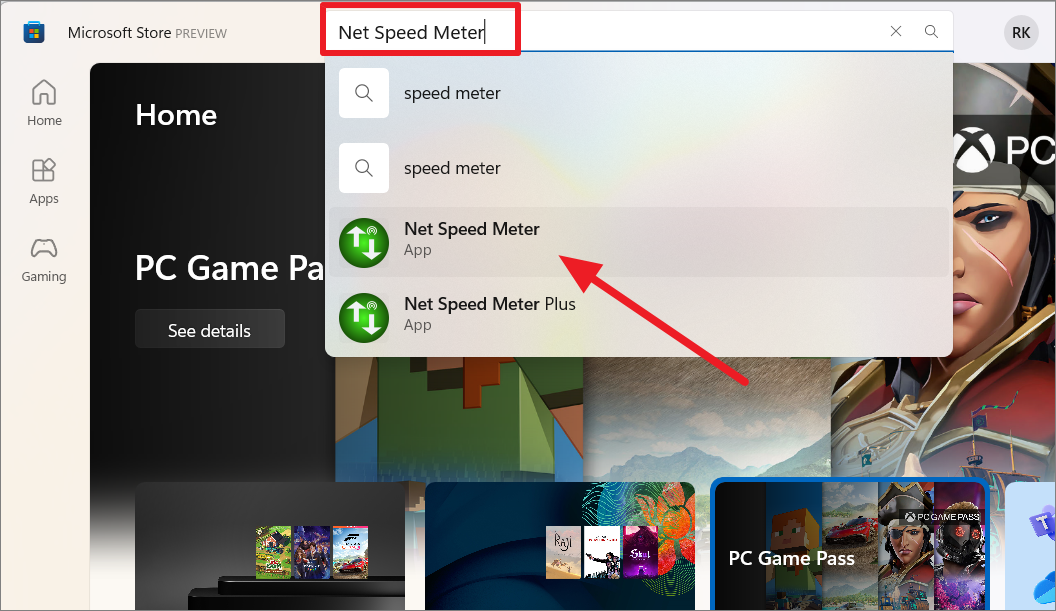 Step 2: In the Microsoft Store, use the search bar at the top to type Net Speed Meter. From the search results, select the Net Speed Meter app.