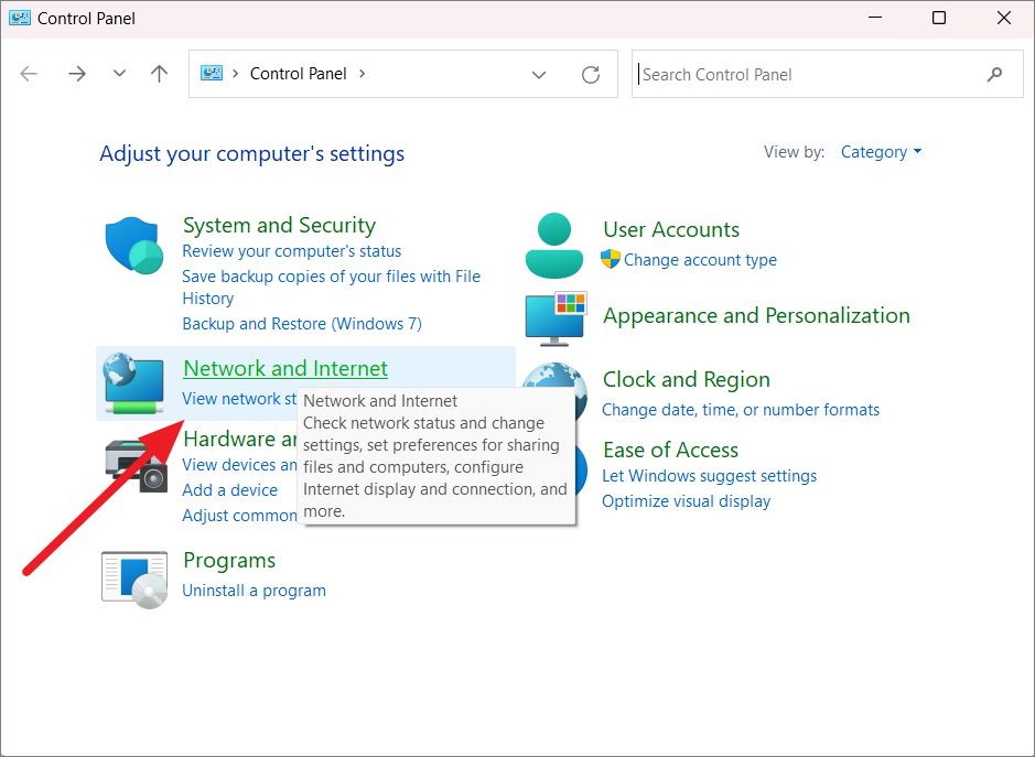 Step 2: In the Control Panel, click on Network and Internet.