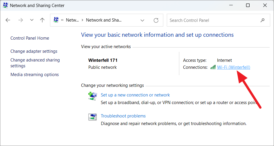 Step 4: In the Network and Sharing Center, find your active network connection next to Connections and click on the network link.