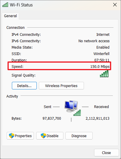 Step 5: A new window will open displaying your connection status. Here, you can see the link speed under the Speed field.