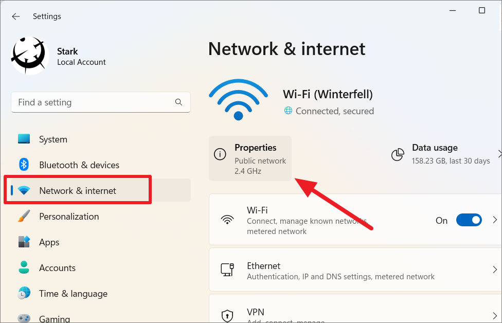 Step 2: In the Settings window, navigate to the Network & Internet section on the left pane. On the right side, click on Properties under your active network connection.