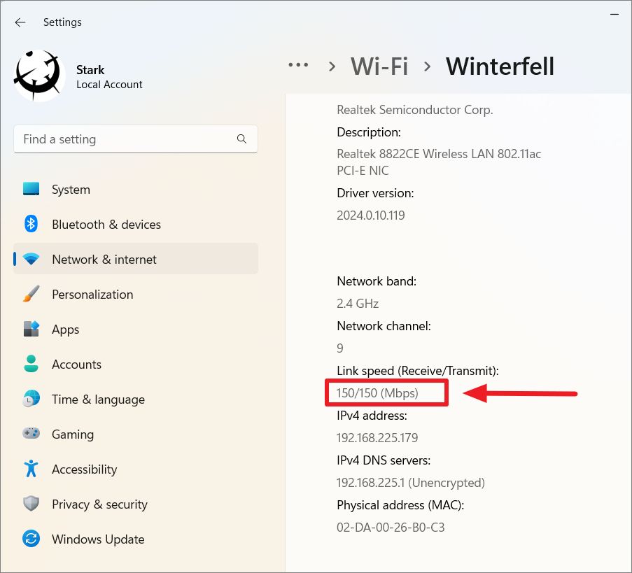 Windows Settings also provide quick access to view your network adapter's link speed.