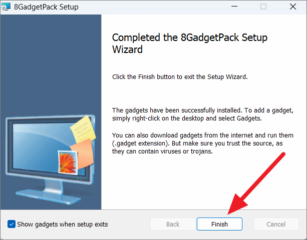 Step 3: If prompted by User Account Control, select Yes to allow the installation. After the installation completes, ensure the box next to Show gadgets when setup exits is checked, then click Finish.