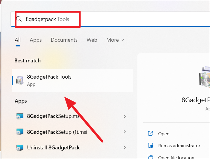 Step 4: The 8GadgetPack sidebar will appear on the right side of your desktop. If it doesn't open automatically, search for 8GadgetPack in the Start menu and select 8GadgetPack Tools.
