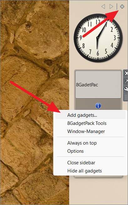 Step 6: To add the Network Meter gadget, right-click on the sidebar and select Add gadgets... Alternatively, click the plus icon at the top of the sidebar.
