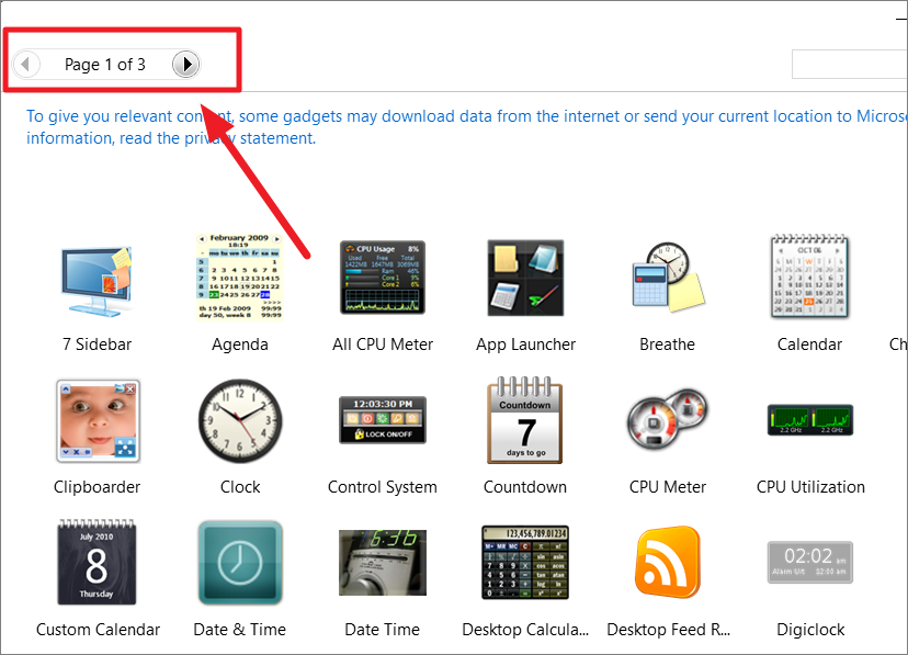 Step 7: In the gadgets window, navigate through the pages using the arrow buttons to find the Network Meter gadget.