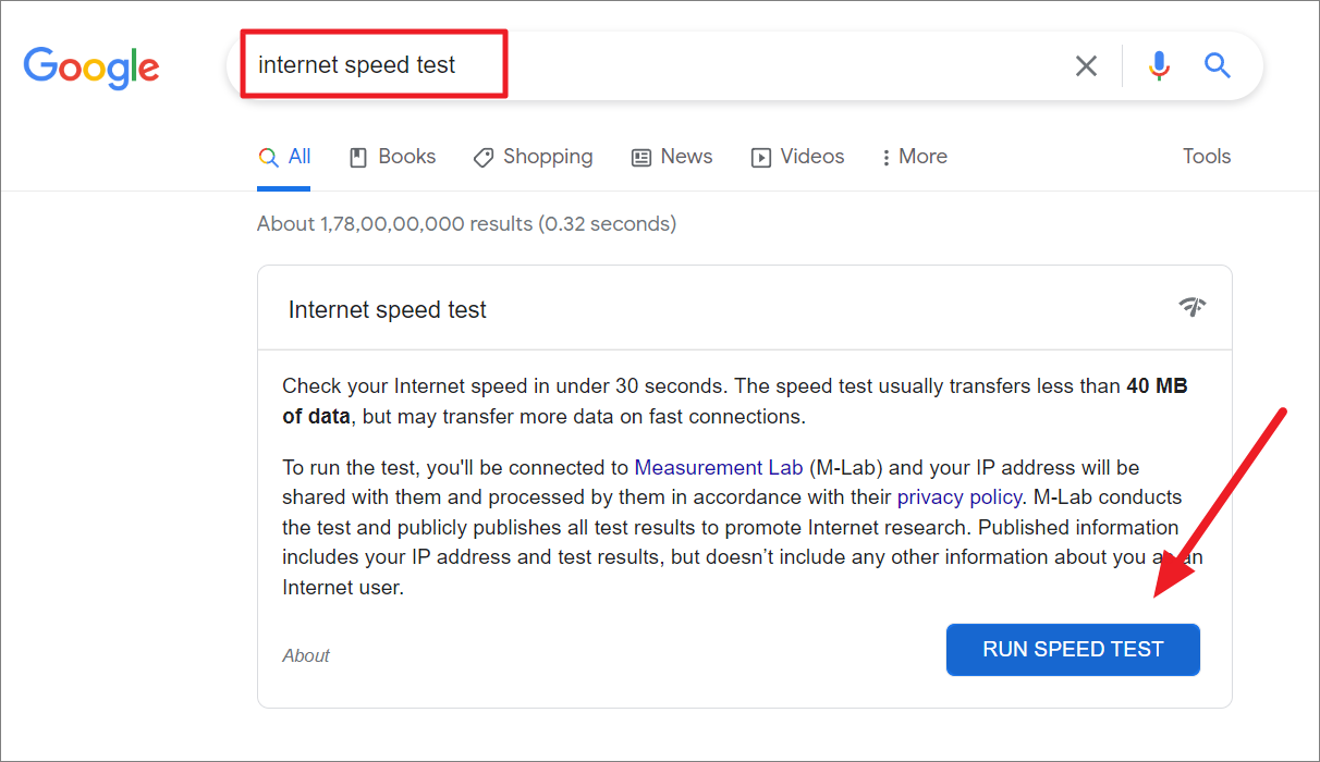 Option 2: Alternatively, you can use Google's built-in speed test. Simply search for Internet speed test on Google, and click the Run Speed Test button in the search results.