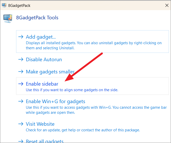 Step 5: In the 8GadgetPack Tools window, click on Enable Sidebar to activate the sidebar.