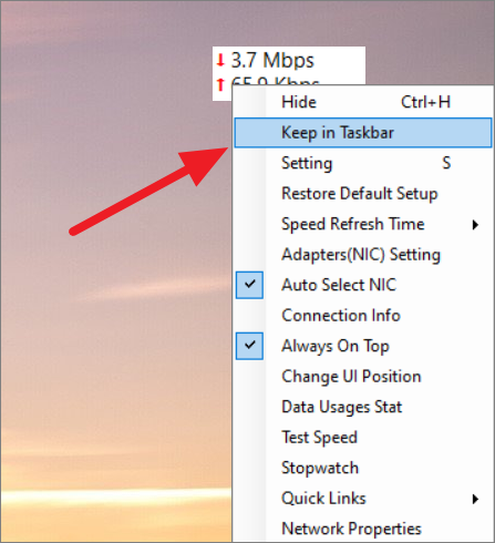 Step 7: To pin the speed meter to the taskbar, right-click on the meter and select Keep in Taskbar. This ensures the meter remains visible even when other applications are open.