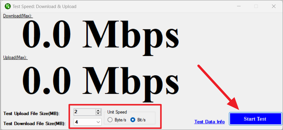 Step 9: In the Test Speed window, select the file sizes for upload and download tests. You can also choose the speed unit between Byte/s and Bit/s. Click Start Test to begin measuring your connection speed.