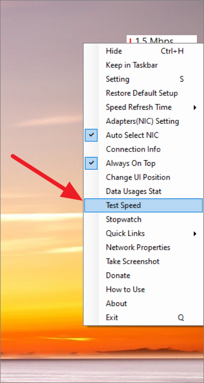 Step 8: If the meter displays "0.0 kbps" when you're not actively using the internet, it's because there is no data being transferred at that moment. To test your maximum internet speed, right-click on the speed meter or its system tray icon and choose Test Speed.