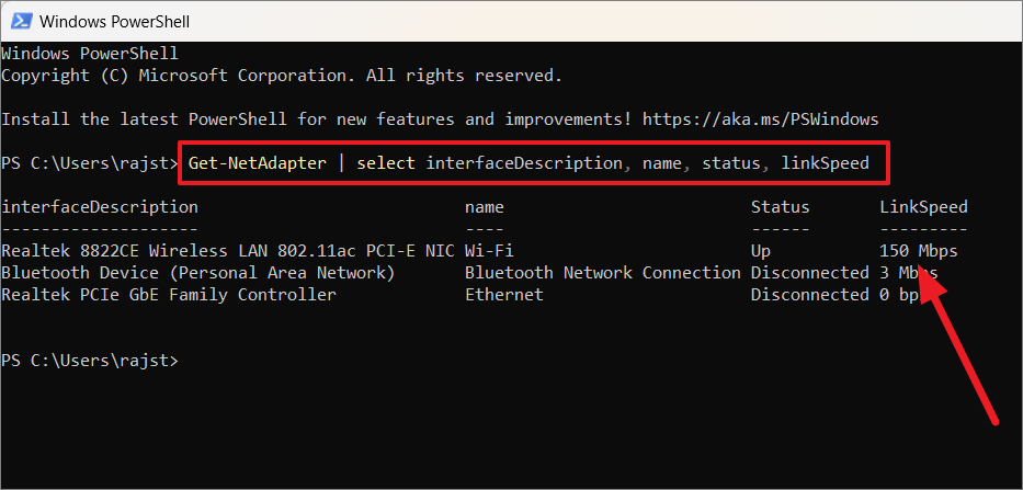 Windows PowerShell provides a built-in method to check your network adapter's link speed. This reflects the maximum speed between your device and the router, which is helpful for diagnosing hardware capabilities.
