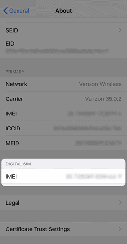 On the About screen, scroll down to Digital SIM IMEI and share it with your service provider.