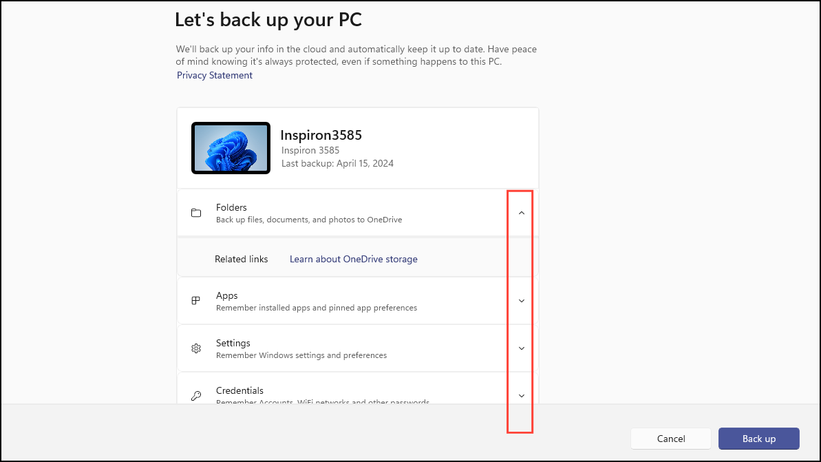 Step 2: In the Windows Backup app, you'll see four backup options: Folders, Apps, Settings, and Credentials. Click the downward arrow next to each option to expand and configure them.