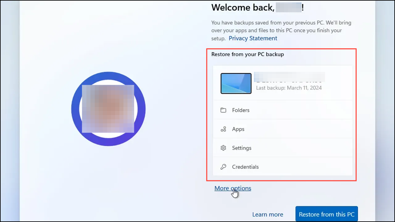 Step 2: During the setup, you'll be notified that backups from your previous PC are available. Select the backup from your old PC to restore your data.