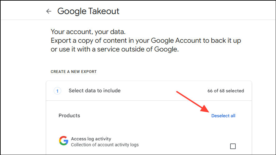 - You can download all your Google data from here but only need data relating to your YouTube subscriptions. So, first, click on 'Deselect all' under the 'Create a new export' section.