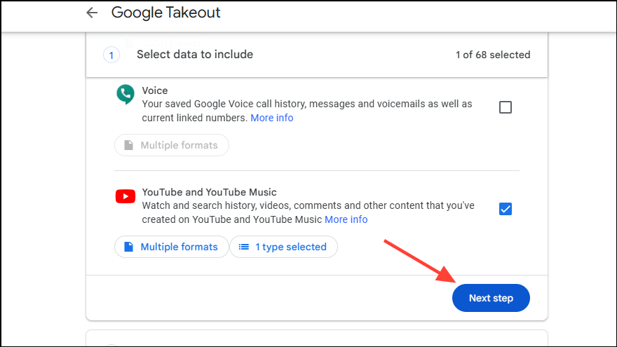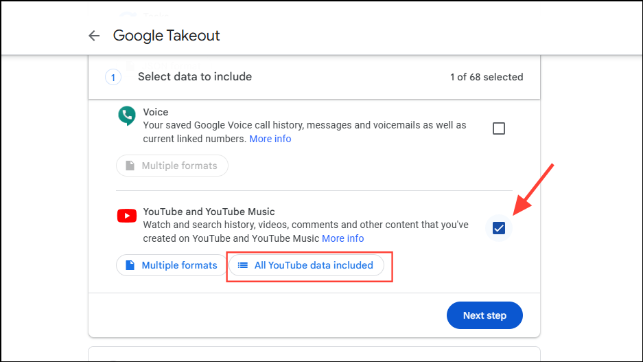 - Then scroll down to the bottom, click on the checkbox for 'YouTube and YouTube Music', and click on 'All YouTube data included' at the bottom.