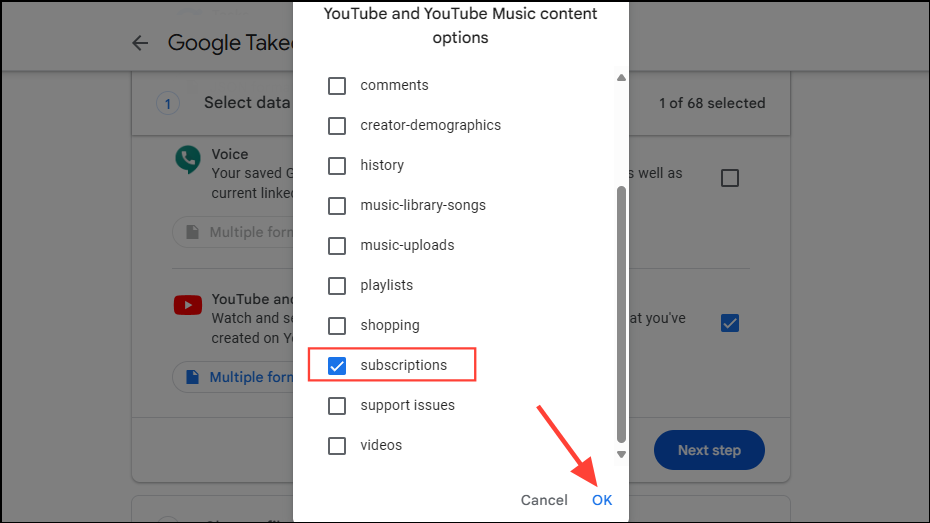 - You will be able to see all the YouTube data you can download. Deselect everything other than 'Subscriptions' and click on OK.