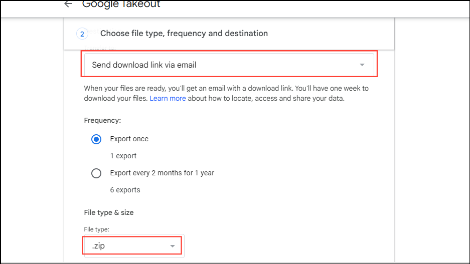 - Check that the 'Send download link via email' is selected in the 'Transfer to' dropdown and the 'File type' selected is .zip.