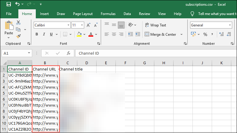 - The file contains a table with three columns - Channel ID, Channel URL, and Channel Title. You need the entries in the Channel URL column.