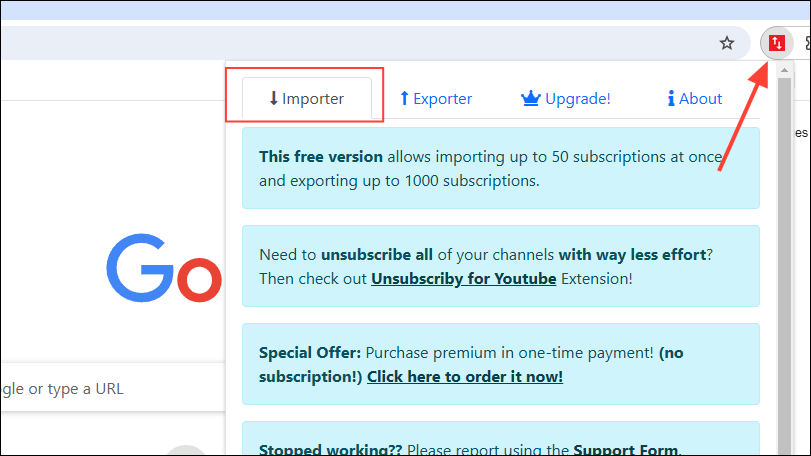 - Click the Subscriptions Importer extension button on the toolbar and check that you are on the 'Importer' tab.