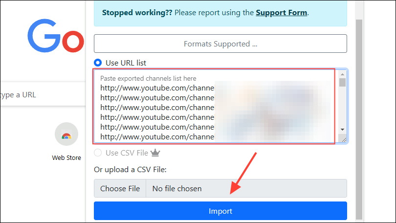 - The Subscriptions Importer extension will open the pasted URLs in new tabs and subscribe to the channels. It will notify you when it cannot subscribe to a channel so you can do so manually.