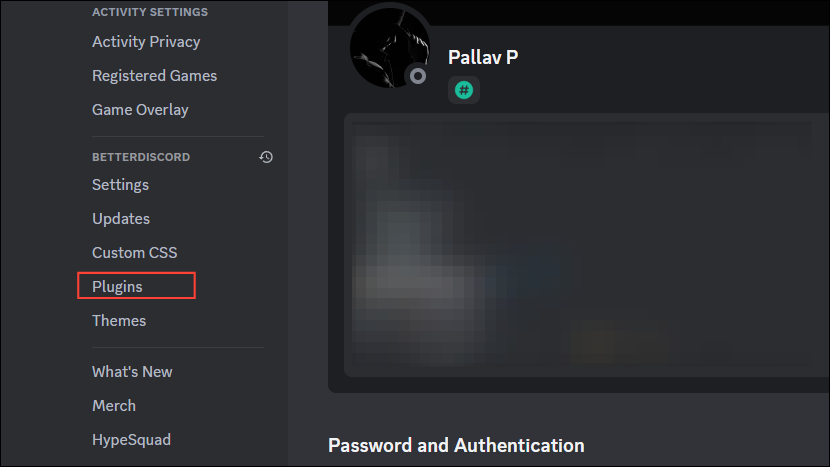 - Scroll down and click on 'Plugins' on the left under the BetterDiscord section.