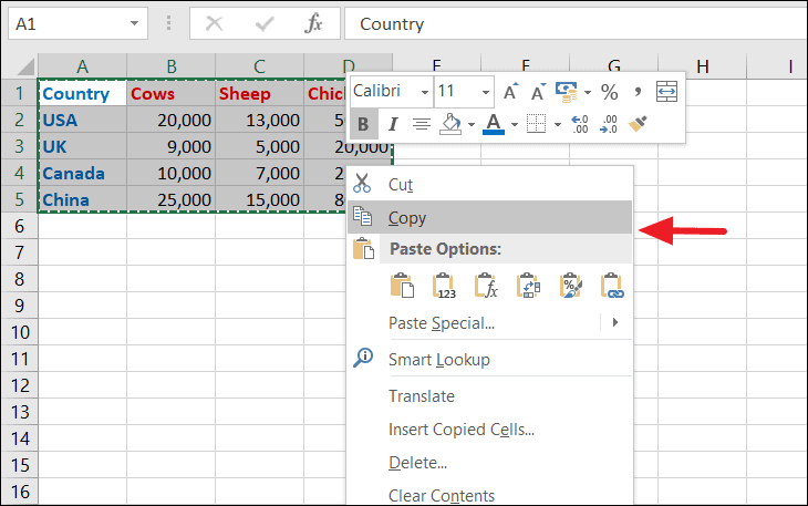 Copy the selected cells by right-clicking and choosing Copy, or by pressing CTRL + C.
