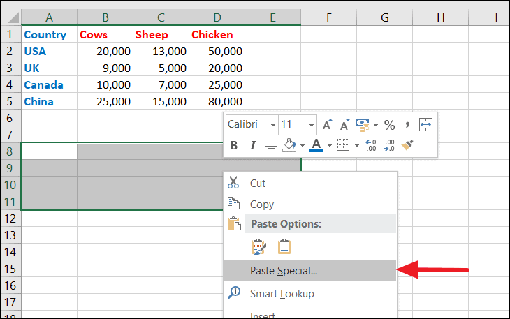 Step 3: Right-click on the destination cell and select Paste Special from the context menu.