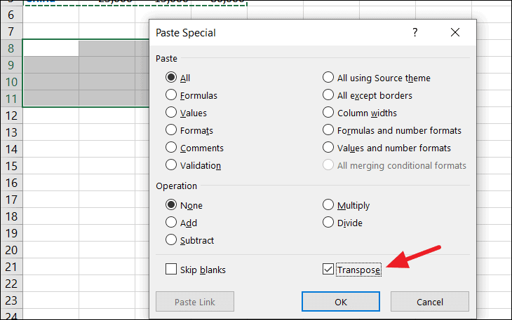Step 4: In the Paste Special dialog box, check the Transpose option at the bottom. Then, click OK to paste the transposed data.