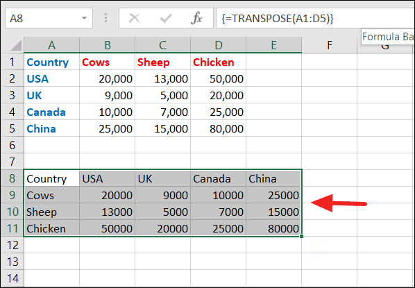 Step 4: Press Ctrl + Shift + Enter to enter the formula as an array formula. The transposed data will populate in the selected range.