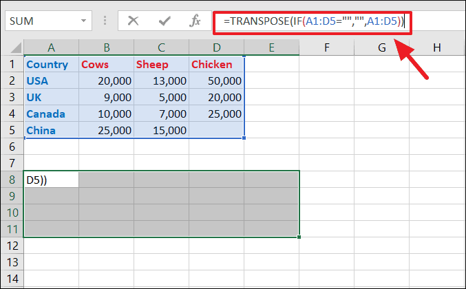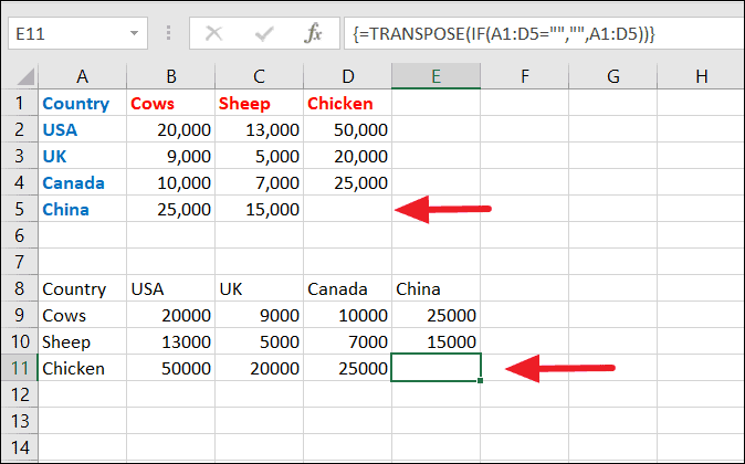 Step 1: Modify your TRANSPOSE formula to include the IF function: =TRANSPOSE(IF(A1:D5="","",A1:D5)). This formula checks each cell in the range A1:D5; if a cell is empty, it returns an empty string (""); otherwise, it transposes the cell's value.