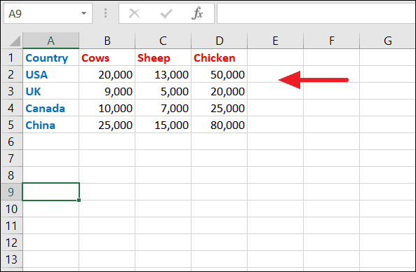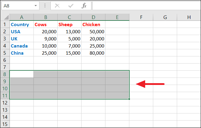 Step 2: Select a blank area in your worksheet where you want the transposed data to appear. The selected range should have the opposite dimensions of the original data rangeāin this example, 4 rows and 5 columns.