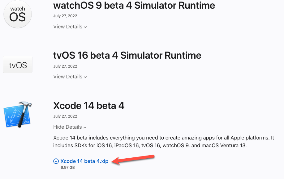From the More Downloads page, download the latest version of Xcode 14 beta (which is Xcode 14 beta 4 at the time of writing this).