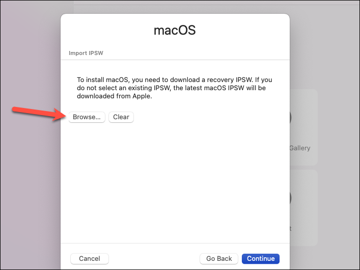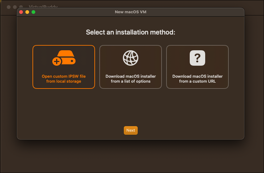 If you want to install any other OS version and you have a custom IPSW file, select the first option. Then, select the file from your Mac to proceed. Otherwise, if you have a link to the macOS Installer, select the third option and enter the URL from where you want VirtualBuddy to download the macOS.