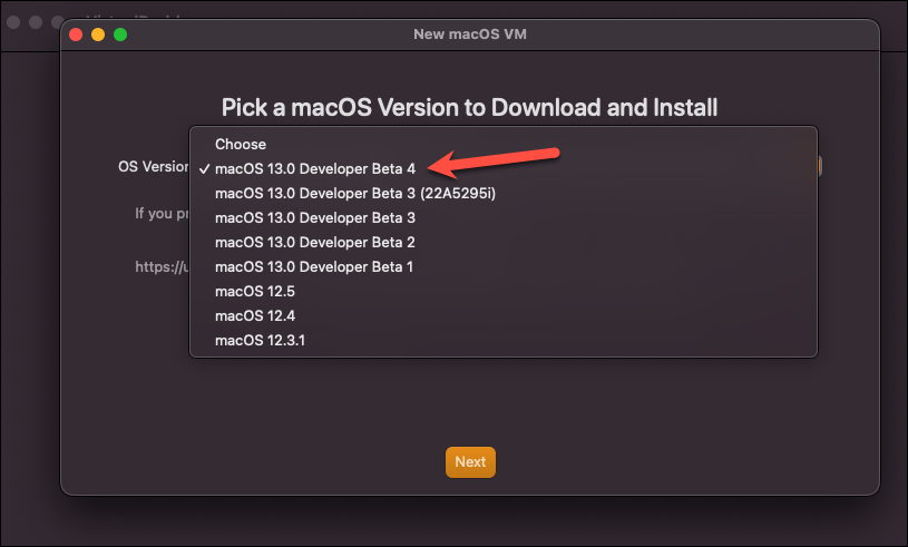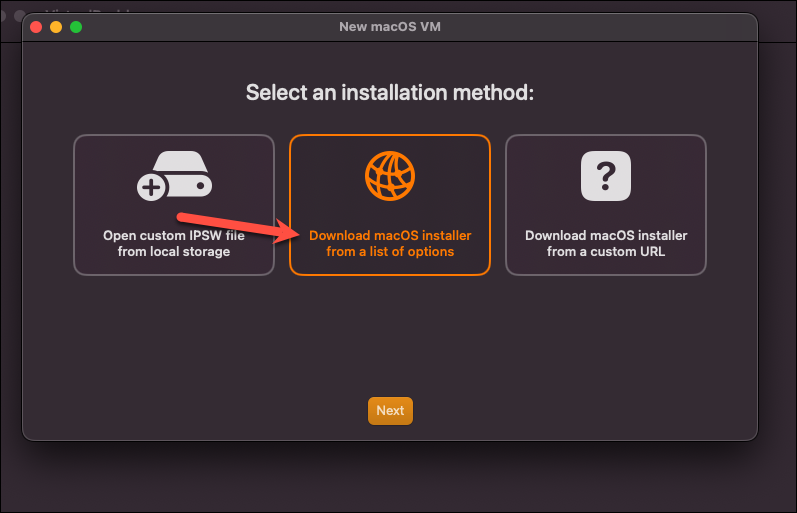The easiest is the second option if you want to install one of the available versions in VirtualBuddy. Select it and click ‘Next’.