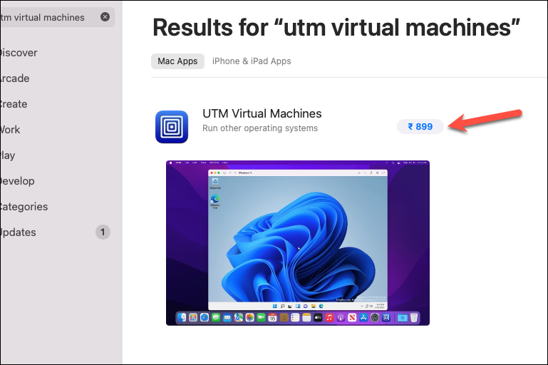 To install UTM from the Mac App Store, head to the App Store and search for UTM. Then, click the option that shows the price of the app to install it.