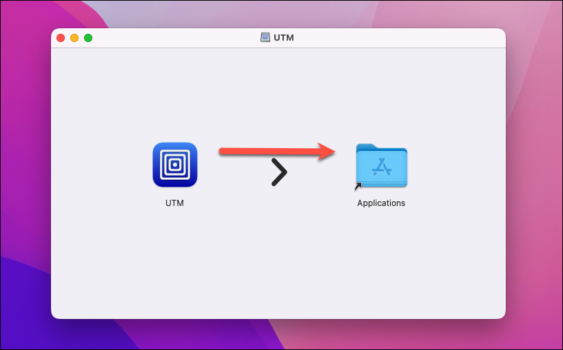 In the window that opens, drag the icon for ‘UTM’ onto the ‘Applications folder’ icon to add it to your applications. This way, you won’t have to run it from the dmg file every time.