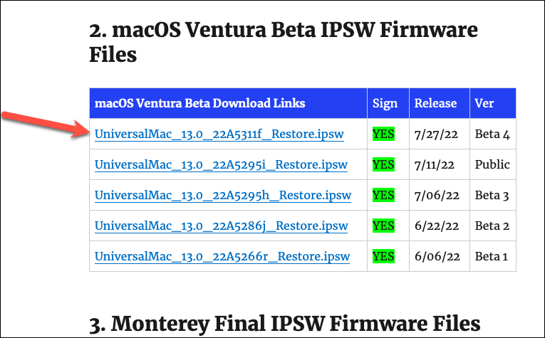 You can download the IPSW file for macOS Ventura beta from here. Open the link and download the latest signed IPSW file under macOS Ventura beta links.