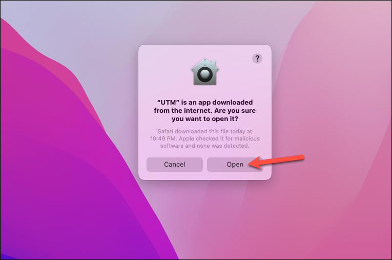 Run UTM from your applications folder or the launchpad. The first time you launch UTM, a warning will appear that it is an app downloaded from the internet. Click ‘Open’ to proceed.