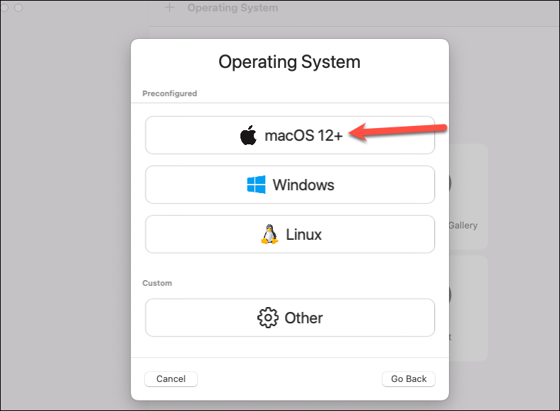 Now, select ‘macOS 12+’ the Operating System options.