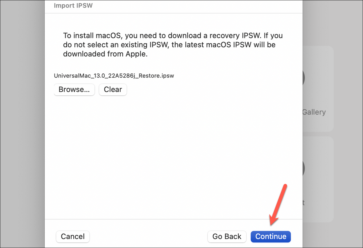 You’ll also need to download the IPSW restore file for macOS Ventura. It’s better to download the IPSW file manually since there have been reports of trouble when letting UTM download the IPSW file for Ventura automatically. If you want to virtualize Monterey, you can let UTM handle the download; it works perfectly fine in that case.