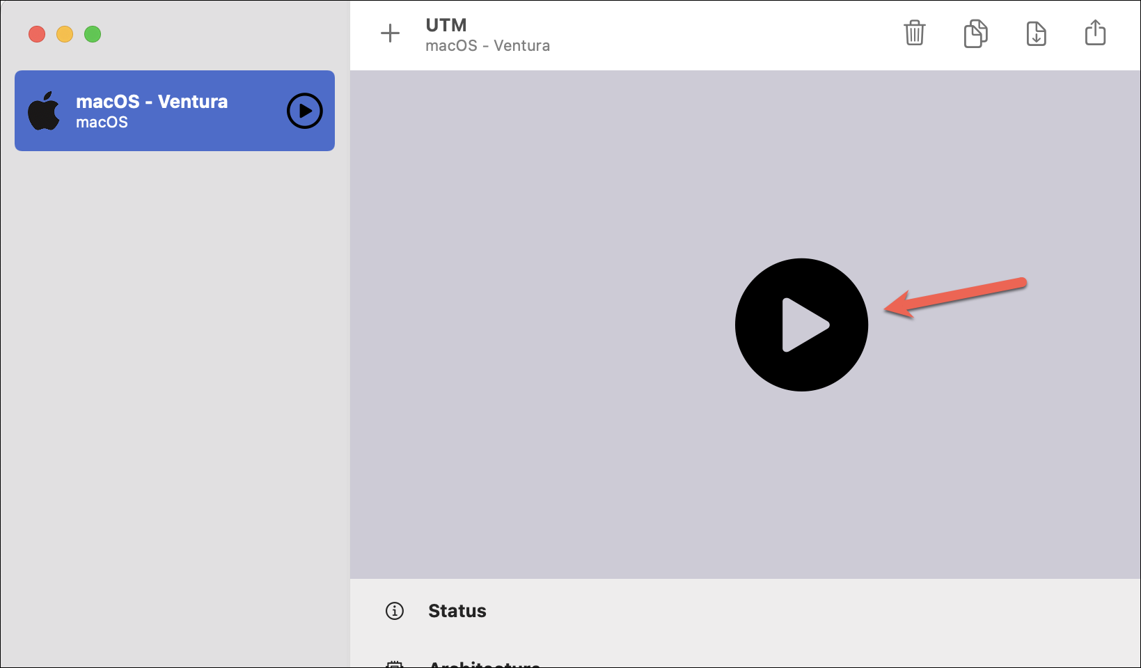 The virtual machine is created and ready to be initialized. Click the ‘Play’ button to initialize it.