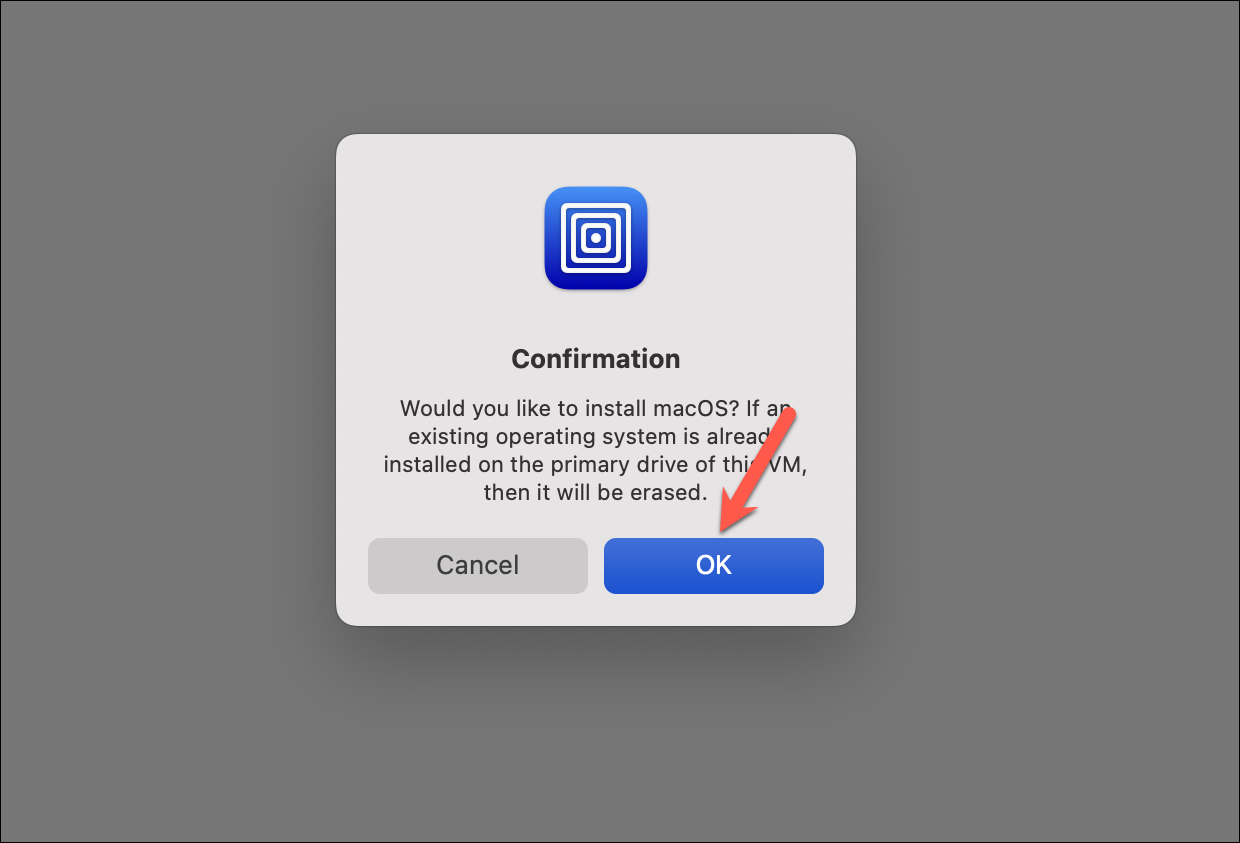 A confirmation prompt will appear asking you if you want to install the macOS, click ‘OK’. UTM will begin the installation of the macOS.