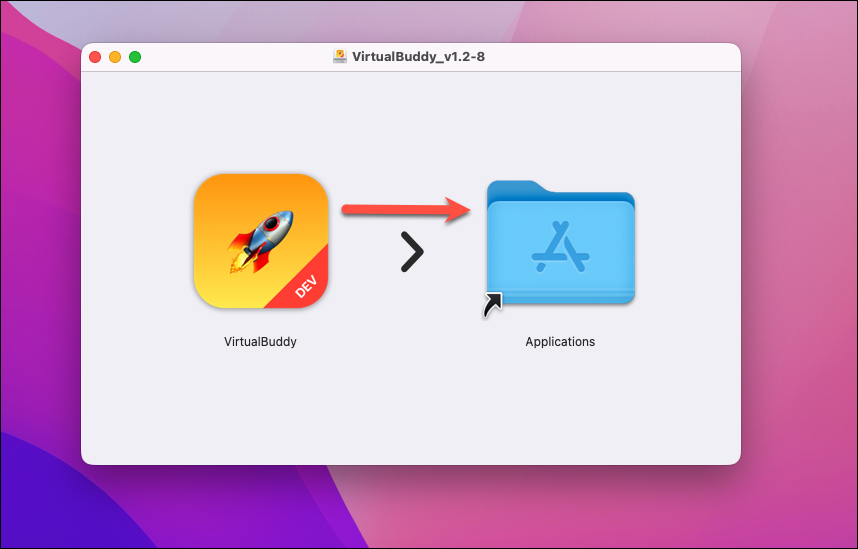 Then, drag the ‘VirtualBuddy’ icon onto the ‘Applications folder’ icon from the window that appears to add it to your applications so you don’t have to run it using the dmg file every time.