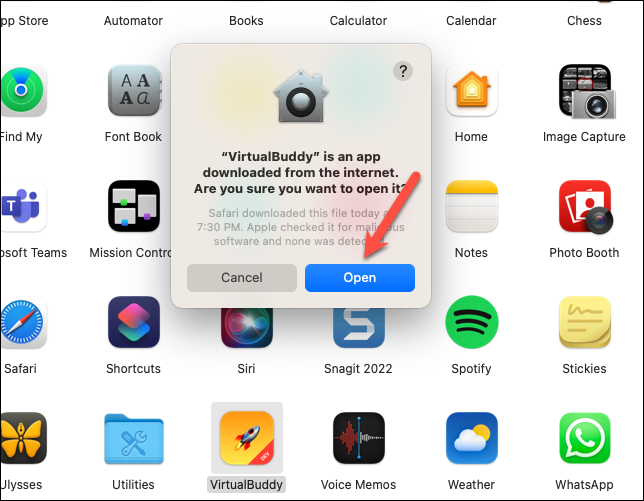 A prompt will appear saying that VirtualBuddy is an app downloaded from the internet. Click ‘Open’ to continue.