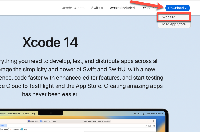 Go to this link for Xcode 14 beta on Apple’s developer website. Sign in with your Apple account and then click the ‘Download’ button. Select ‘Website’ from the expanded options.