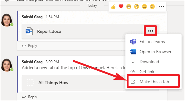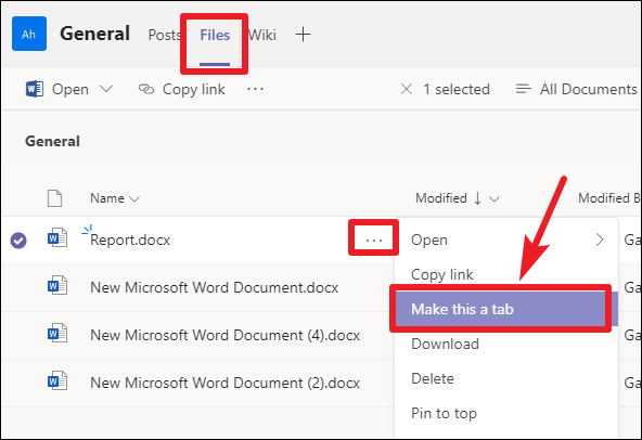 Step 3: Choose 'Make this a tab' from the menu. The file will appear as a new tab in the channel.